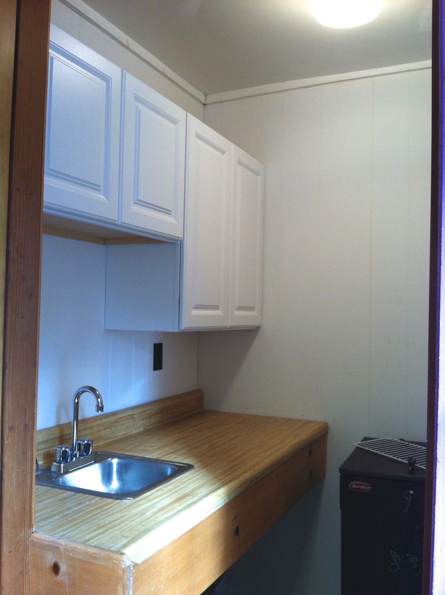- Kitchenette: Small counter, cabinets, sink and room for a small fridge